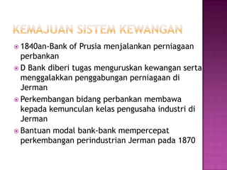 Bagi memajukan perindustrian kerajaan Jerman telah memberikan tumpuan untuk memajukan kemudahan infranstruktur seperti sistem pengangkutan dan komunikasi. Perkembangan sektor perindustrian di Jerman disebabkan oleh kekayaan sumber bahan mentah. 1879 Jerman menamatkan dasar perdagangan bebas dan mengamalkan dasar melindungi industriHal ini membantu dalam menambahkan hasil pengeluaran Jerman antara tahun 1872 -1910Bismarck telah memperkenalkan undang-undang insuran sosial pada 1883 bagi memastikan para pekerja mendapat perlindungan8Fungsi.